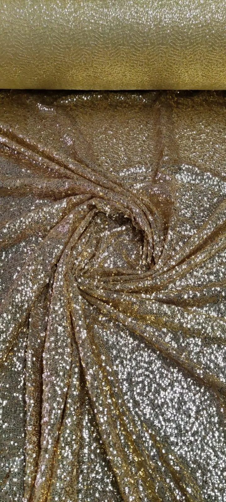 Lentejuela cosida dorado – 13% lurex/87% poliester – Ancho en Mts: 1,40 – Peso/rinde:150g/m2. La Tela es aplicable para: Disfraces, Vestidos, Decoración.