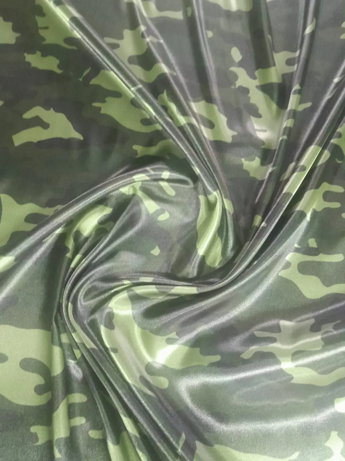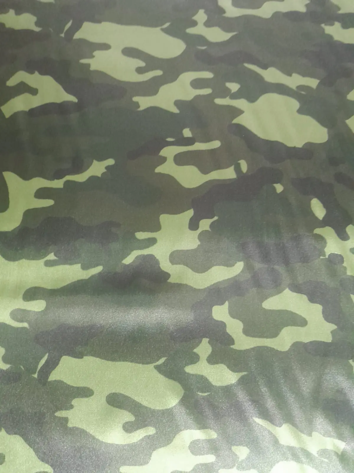 Raso estampado Camuflado verde – 100% poliester – Ancho en Mts: 1,50 – Peso/rinde:85gr/m2. La Tela es aplicable para: Vestidos, Forrería, Disfraces.